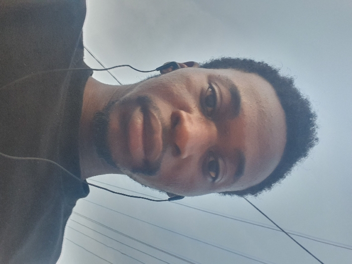 A selfie of a dark-skinned man with short curly hair, wearing black earbuds and a black shirt