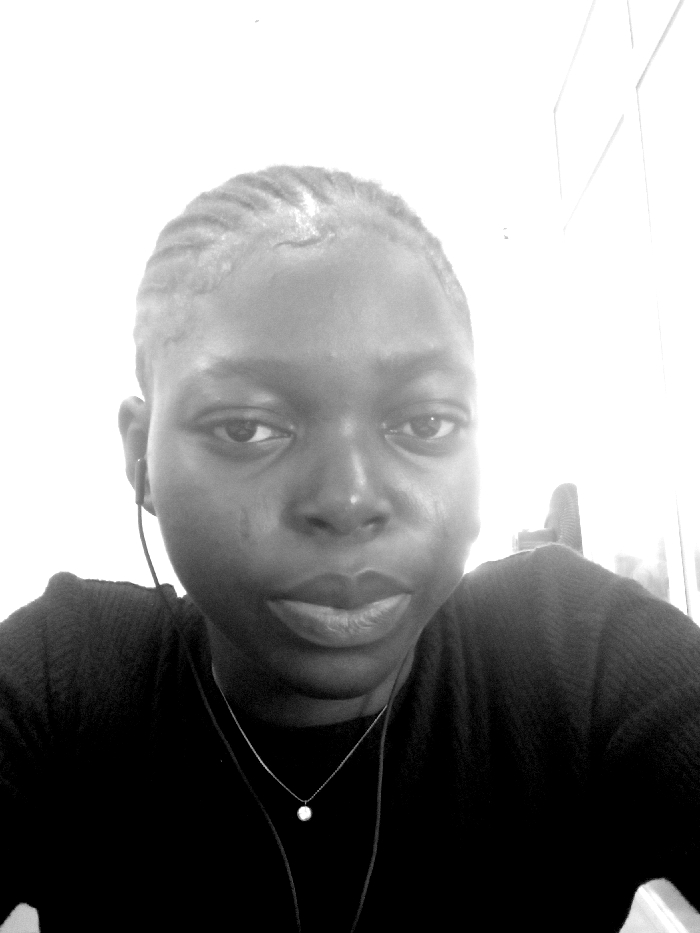 A monochrome, close-up portrait features a young adult individual with dark skin and braided cornrows, looking directly at the camera. The person is wearing a black ribbed long-sleeved top and a silver necklace with a small, circular pendant. A black wired earbud is visible in the left ear. The background is predominantly overexposed white, with faint vertical and horizontal lines in the upper right corner suggesting a doorframe or cabinet, and a dark, indistinct object, possibly a fan, partially visible behind the subject's right shoulder. The scene is indoors with high-key lighting, located in the city of Lagos, Nigeria.