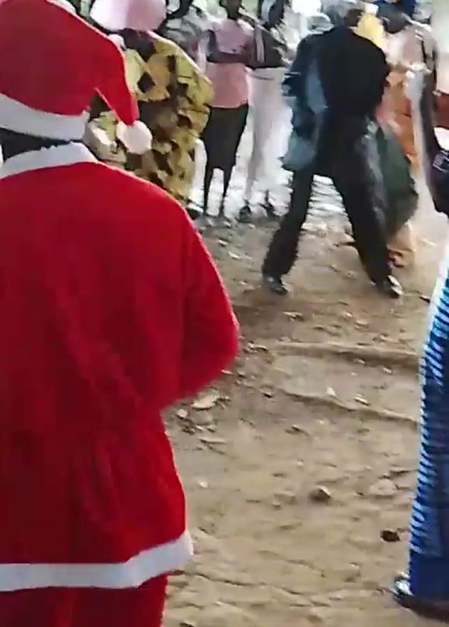 The video features a person dressed as Santa Claus in a red suit and hat with white trim. The individual, who is Black, is also wearing sunglasses and a white beard. They are standing in what appears to be an outdoor gathering, possibly a celebration. There are several people around them, dressed in various outfits. The ground appears to be dirt or sand. The overall setting suggests a festive event, possibly in a community area.