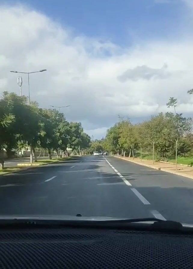 car driving on a two-lane road with trees lining both sides. The sky is blue with some white clouds. The camera is positioned inside the car, looking out through the windshield. There are white lane markers on the road. Other cars can be seen in the distance. The lighting appears to be daytime, with sunlight casting shadows on the road.