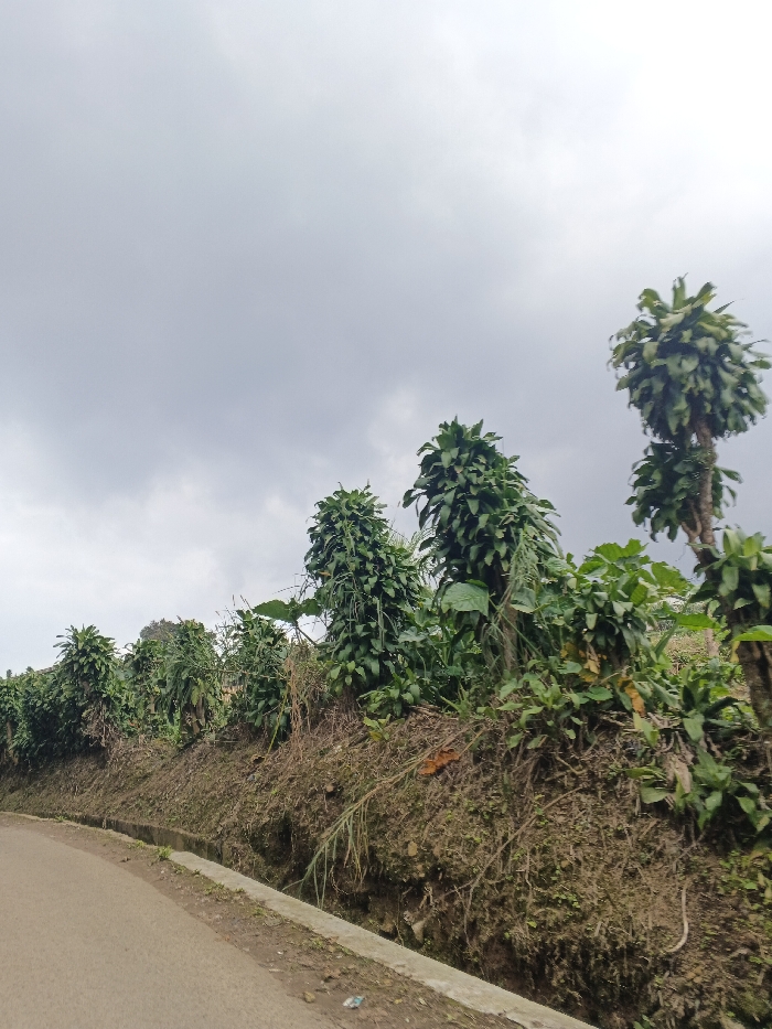 The image displays a roadside scene in Siexiengmai, Laos, under a uniformly overcast sky. A light grey paved road occupies the lower left of the frame, curving slightly and receding into the distance. Adjacent to the road's right edge, a concrete-lined drainage ditch runs parallel. Beyond the ditch, a steep earthen embankment rises, densely covered with green vegetation. This vegetation includes numerous tall, slender, treelike plants with abundant, dark green leaves clustered along their trunks and at their crowns, suggesting a cultivated crop or specific planting. Exposed patches of soil, dried foliage, and root systems are visible on the embankment. The sky above is entirely grey with no discernible breaks in the cloud cover. No individuals, vehicles, or other man-made structures are present in the frame.