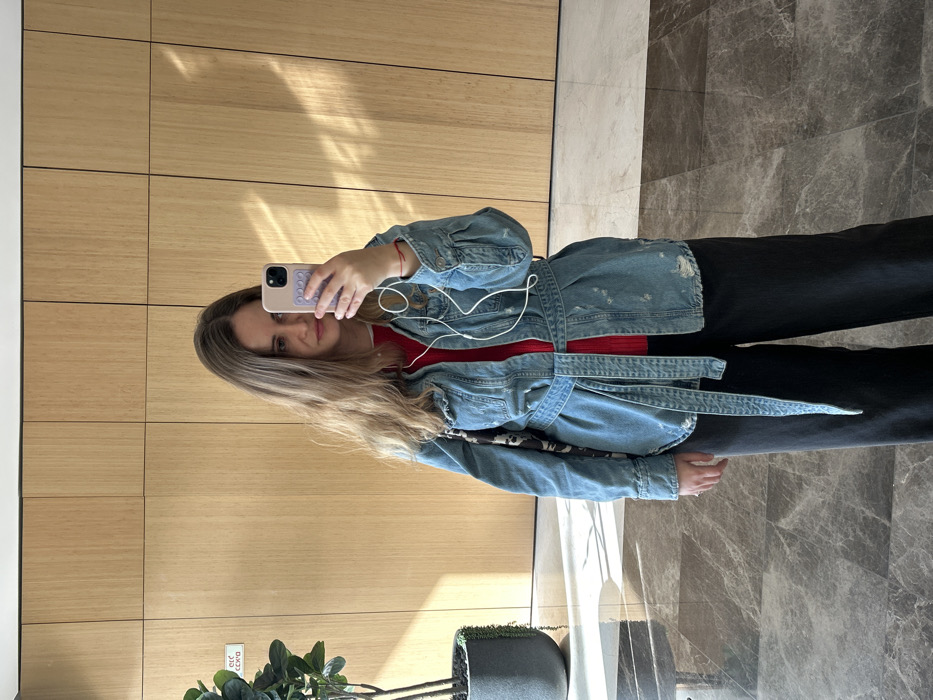 An adult female is depicted in a full-length mirror selfie, positioned centrally within a modern interior space, likely in Kiryat Ono, Israel. The female subject has light brown, wavy hair and is wearing a red short-sleeved top under a distressed light blue denim jacket with a self-tie belt. She is also wearing dark, wide-leg trousers. A red string bracelet is visible on her right wrist, and a patterned strap from a bag is visible on her left shoulder. She holds a light pink smartphone with a purple patterned case in her right hand, directed towards the mirror. White wired earbuds are connected to the phone, with the wires draped over her chest and left shoulder. The background consists of a smooth, light wood-paneled wall, divided into vertical rectangular sections. Sunlight casts dappled patterns on the wall and floor, particularly on the right side of the image. The floor is composed of large, polished dark grey and brown marble or granite tiles with natural veining. To the far left, a large potted plant with dark green leaves is visible in a cylindrical grey planter. Faint, reversed Hebrew text, possibly "כניסה" (Entrance) or a similar directional sign, is visible on the wall to the left of the plant, indicating the image is a reflection. The overall environment suggests a well-maintained lobby or common area of a building.