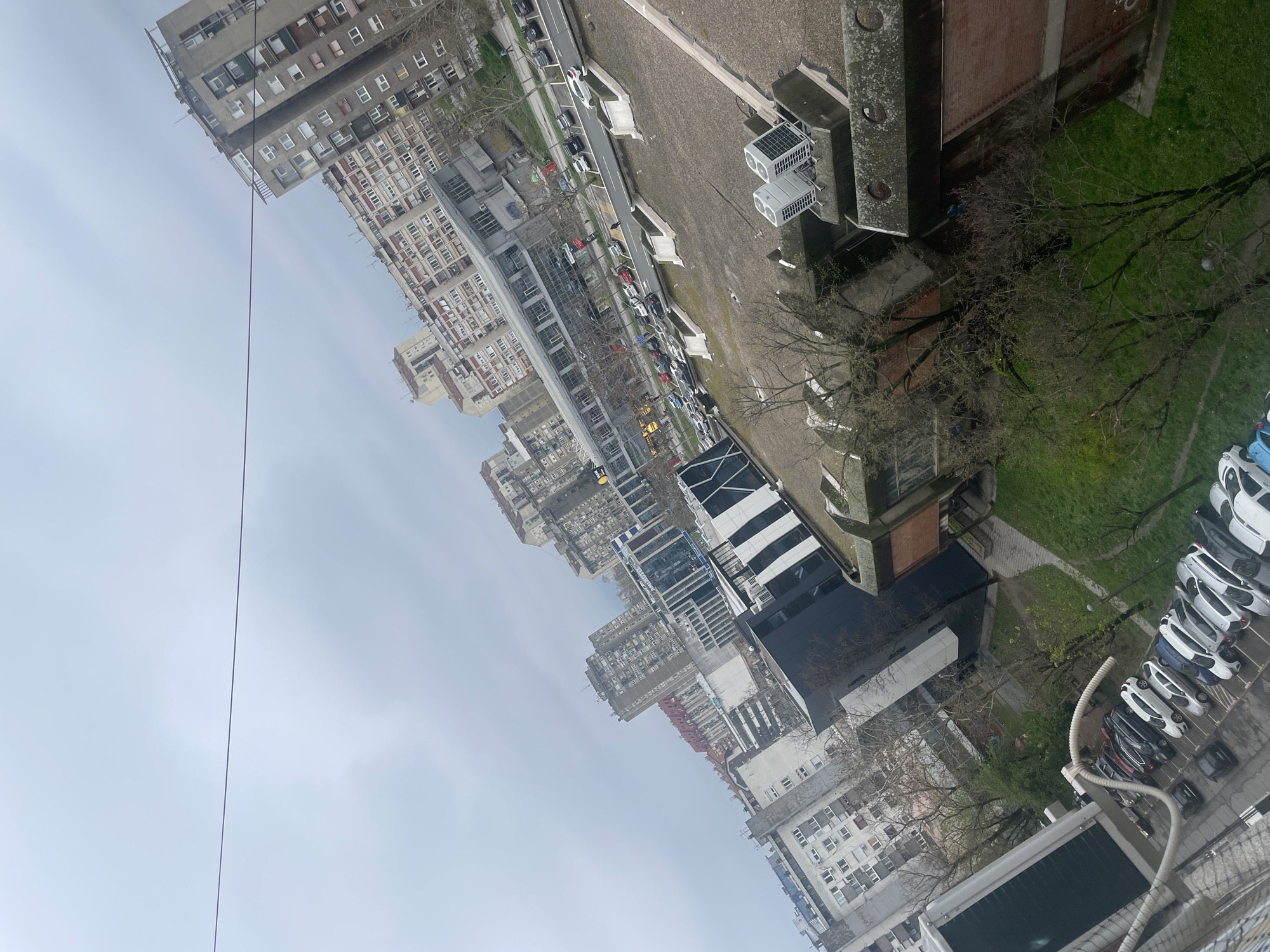 n aerial view of a portion of Novi Sad, Serbia, taken from a high vantage point, likely an upper floor of a building. The scene includes residential and commercial buildings of varying heights and architectural styles, a street with parked cars, a green space with trees, and a parking lot filled with vehicles. The sky is overcast. A visible power line or cable cuts across the upper left portion of the frame. The buildings are a mix of older, concrete structures and newer, glass-fronted office blocks.