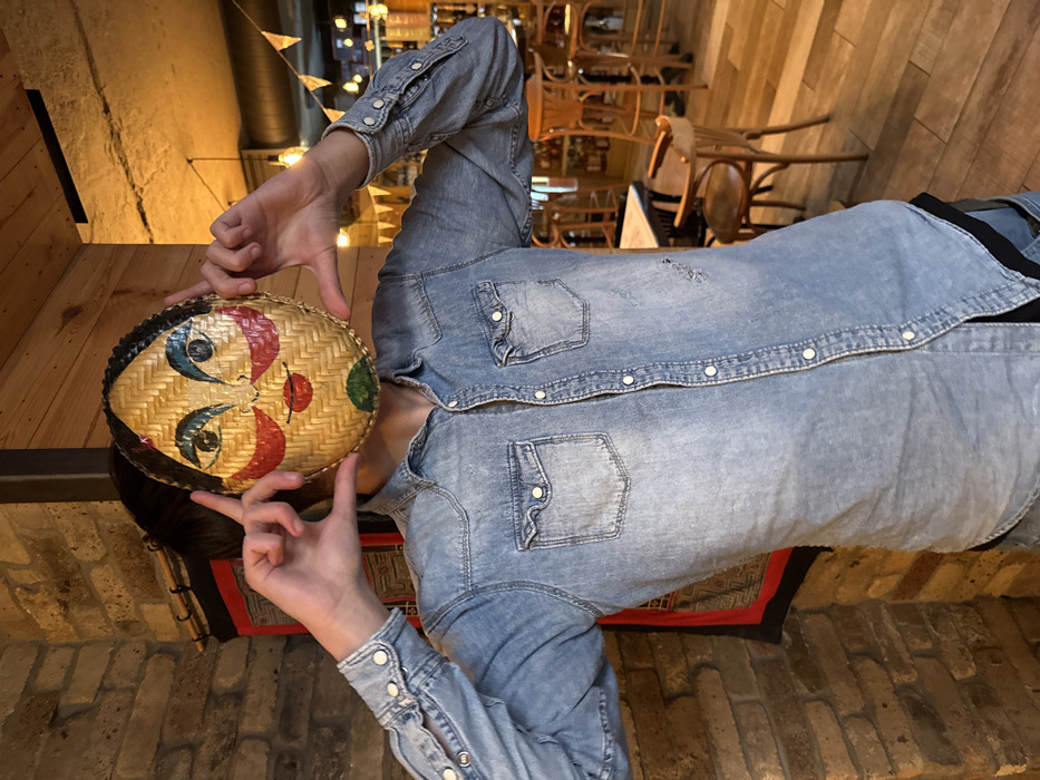 An individual, whose face is obscured by a mask, wears a light blue denim shirt with snap buttons and two chest pockets. They hold an oval, woven straw mask with painted features: black hair, blue eyes, red cheeks, red lips, and a green chin detail. The mask has a black border. The individual's hands, with thumbs and index fingers forming L-shapes, frame the mask. To the left, an exposed brick wall features a dark textile art piece with a red frame. The background right reveals a commercial interior with wooden wall paneling, several light wood chairs and bar stools, a bar counter with bottles, and a string of triangular flags suspended overhead. Exposed light bulbs hang from the ceiling. The floor is light wood planking. The scene takes place within a commercial establishment in Yerevan, Armenia.