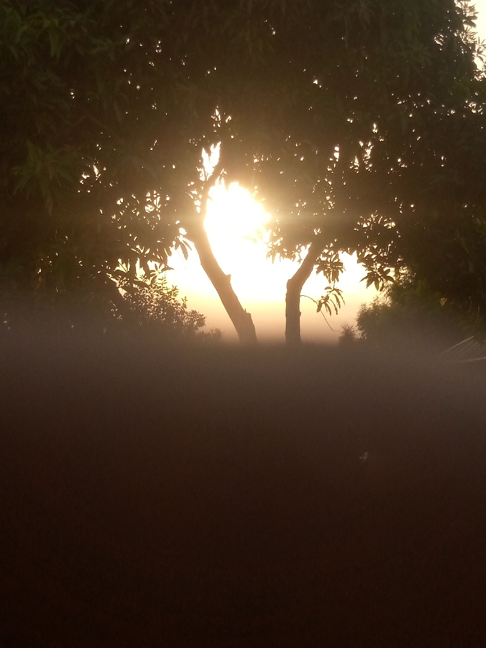 The image depicts an outdoor scene, located in Gaklang, Nigeria, at either sunrise or sunset. The upper half of the frame features a large tree with dense foliage, heavily silhouetted against a brilliant, low-lying sun positioned centrally. Two distinct tree trunks, diverging upward, are visible as silhouettes in the mid-ground. Intense sunlight backlights the scene, producing significant glare and visible light rays through the tree's canopy. The sky behind the trees transitions from bright white and yellow at the horizon to lighter orange and brown. The lower approximately 60% of the frame is a dark, underexposed, reddish-brown to black foreground, devoid of discernible objects or specific details. No human figures or other animate subjects are present; the scene is composed solely of natural elements and ambient light.