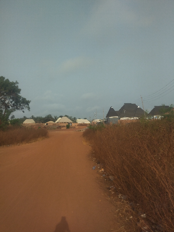 dirt road leading to a small cluster of buildings in a rural area of Tuoniako, Nigeria