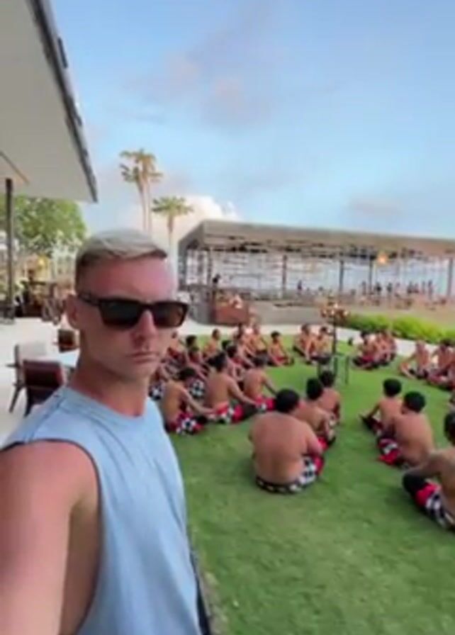 A man with short blonde hair, wearing sunglasses and a blue tank top, holds his phone out to take a video of a group of shirtless men seated on the grass. The men are sitting in a circle, wearing black-and-white patterned wraps around their waists. They appear to be part of some kind of performance or ceremony, as rhythmic vocalizations can be heard. A structure is visible in the background, as well as tables with people seated, and palm trees. The sky is a mix of blue and light clouds.