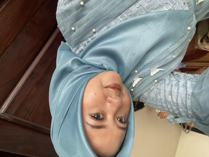 The image displays an indoor scene in Ketegan, Indonesia. The primary subject is a female, presented from the chest upwards, positioned slightly left of center, and looking directly at the camera. She is wearing a light blue satin hijab covering her head and neck, along with a matching light blue garment adorned with a textured or lace-like pattern, pleating, several white pearl beads, and two white butterfly appliqués on her left shoulder area. Her face exhibits applied makeup, including dark eyeliner, mascara, and brown lip color. In the background, to the left and lower, are the visible bare feet and lower legs of a second individual, who appears to be lying down on a patterned rug featuring red and brown tones. A light-colored handbag with a dark strap is also visible on the floor near the second individual. A dark brown wooden structure or panel occupies the right portion of the image.