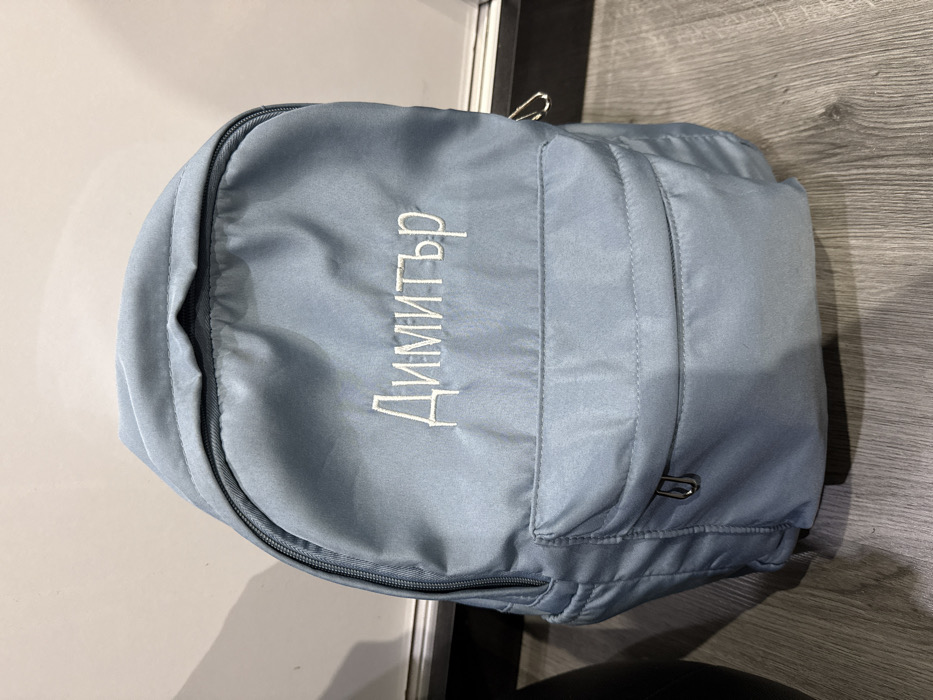 A light blue, nylon-material backpack is positioned upright on a grey, wood-planked floor. The backpack's front features the white embroidered Cyrillic name "ДИМИТЪР" (Dimitar) centrally. A main zipper runs along the top and sides of the backpack, with a metallic zipper pull visible on the right. Below the embroidered name, a horizontal zippered front pocket is present, containing a single metallic zipper pull. The backpack appears slightly creased, indicating minimal contents. Behind the backpack is a plain light-colored wall with a dark, horizontal trim running along its base. A dark, out-of-focus object is partially visible to the left of the backpack. The location is an indoor setting in the city of Unknown, Unknown.