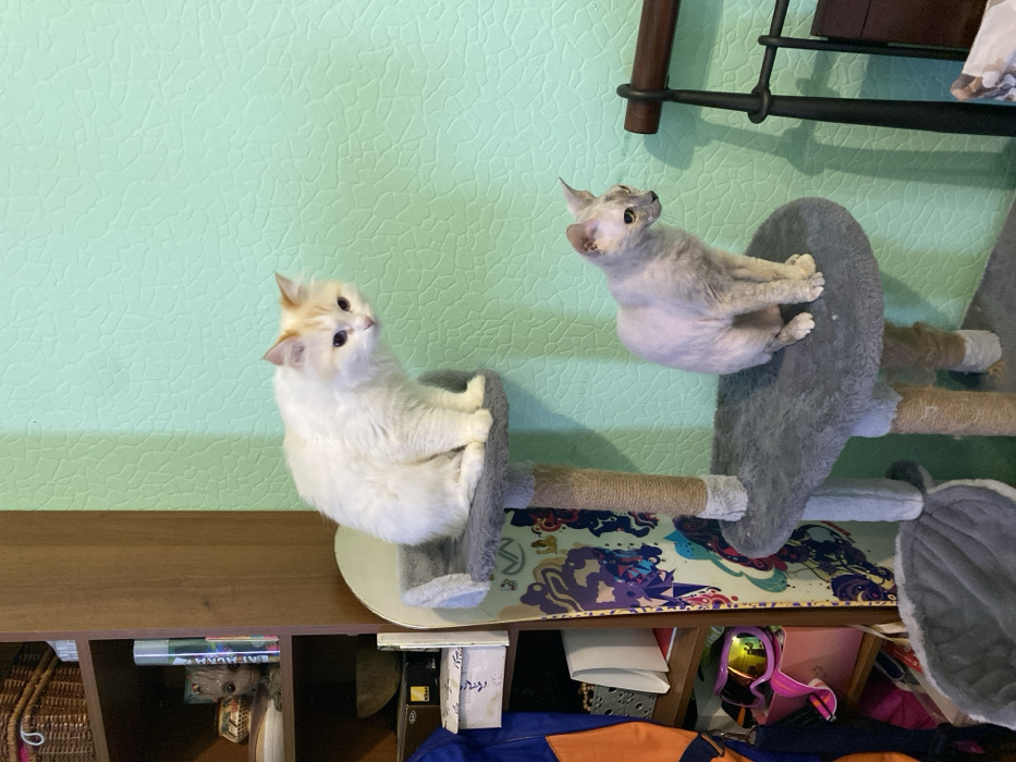 The image depicts an indoor domestic scene in Perm, Russia, featuring two cats positioned on a multi-tiered cat tree