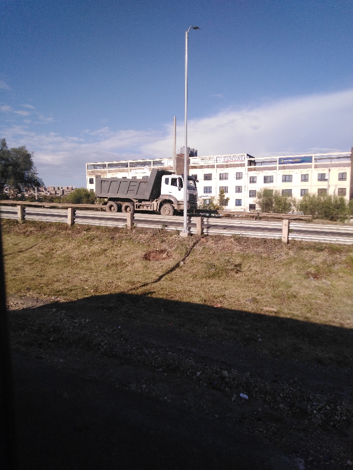 A white and gray dump truck is driving along a highway with a guardrail. A tall silver light pole stands next to the road. Behind the truck is a large white building with numerous windows and signs on the top. The sky is blue with some clouds. The foreground is dominated by a grassy area and a dark, shadowy space.