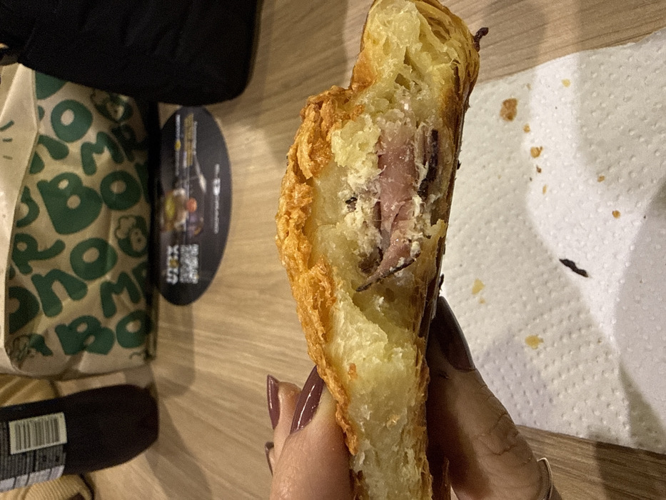 A close-up, elevated perspective depicts a person's hand holding a horizontally bisected pastry, likely a croissant, over a white paper napkin. The pastry exhibits a golden-brown, flaky exterior and a light yellow, doughy interior, filled with several thin slices of light pinkish-brown meat, a white creamy spread, and darker, possibly pickled, fragments. The visible hand displays a thumb and forefinger with dark reddish-brown nail polish. Scattered crumbs are present on the napkin. The immediate background reveals a light-colored wooden table surface. Further back, on the table, a dark brown beverage bottle stands upright. Adjacent to the bottle is a light-colored canvas tote bag featuring a repeating pattern of stylized green letters on a white background, which appear to include "B," "O," and "M." To the right of the canvas bag, a dark, possibly black, fabric item or bag is partially visible. A dark, circular coaster or mat lies flat on the table, displaying a QR code, additional obscured text, and the visible letters "SRX." Based on the distinct branding visible on the canvas tote bag and the overall interior aesthetic common to casual eateries in the region, the scene is assessed to be within a **Tostao' Café y Pan establishment in Bogota, Colombia.**