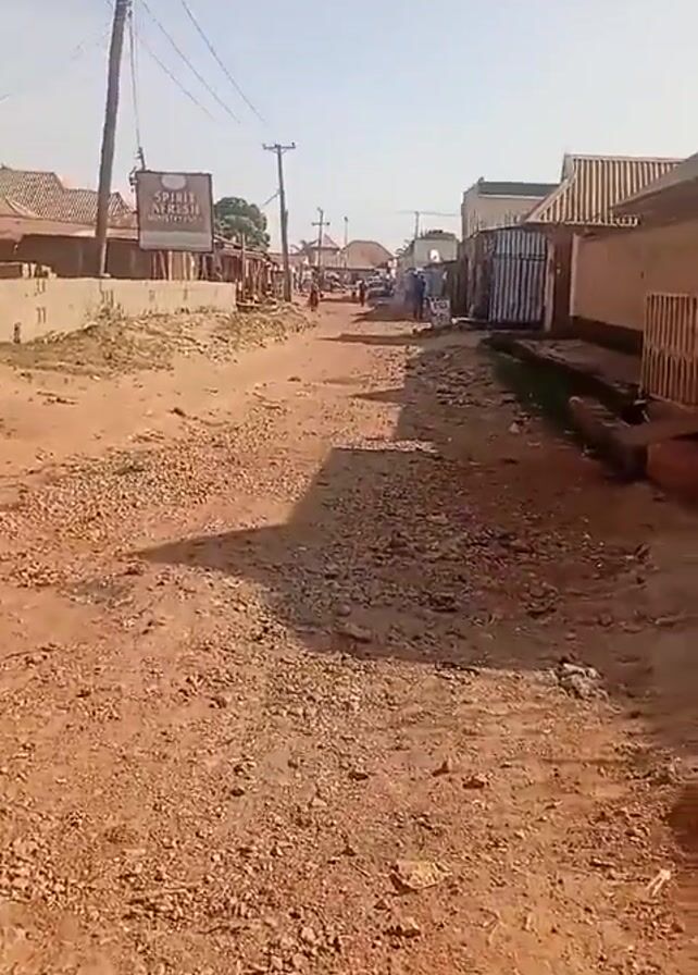 dirt road with gravel and stones, typical of a rural or less developed area. The road stretches into the distance, flanked by low buildings and houses on either side. Power lines are visible overhead, supported by wooden poles. A sign that says "SPIRIT AT BEST" is visible on the left. A few people can be seen walking in the distance down the road. The weather appears sunny.