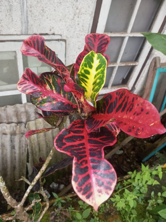 - "The image displays a close-up of a variegated plant, identified as a Croton (Codiaeum variegatum), situated in the foreground" by FM-ioD353, licensed under CC BY 4.0