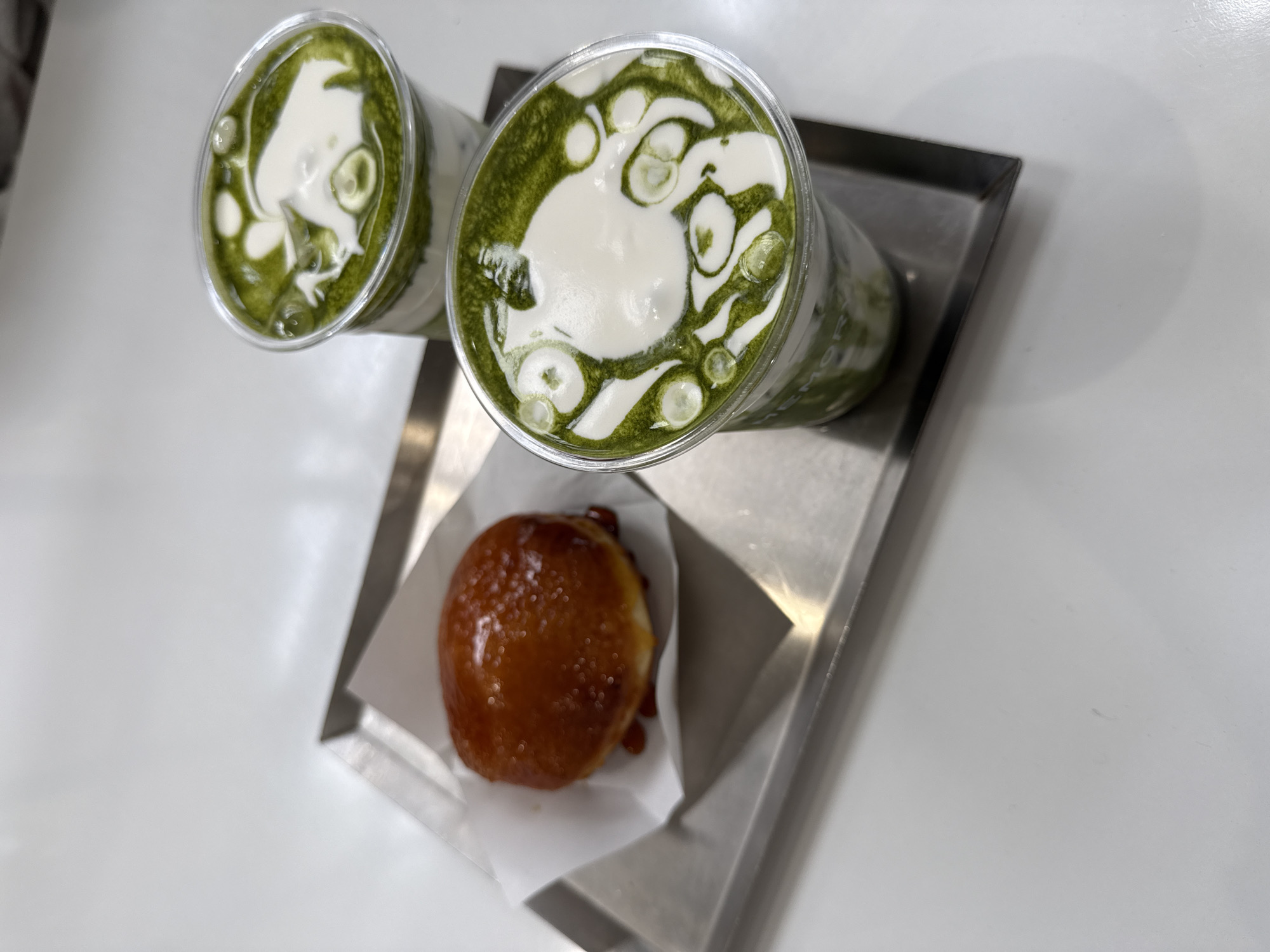 two plastic cups filled with a green matcha-like beverage topped with white foamy cream, and a glazed donut, all sitting on a small, silver, rectangular tray. The tray is placed on a white, flat surface. The scene is likely indoors due to the controlled lighting and the clean, flat surface. Without further information, it is impossible to confirm that this scene is in Los Angeles, or any specific location.