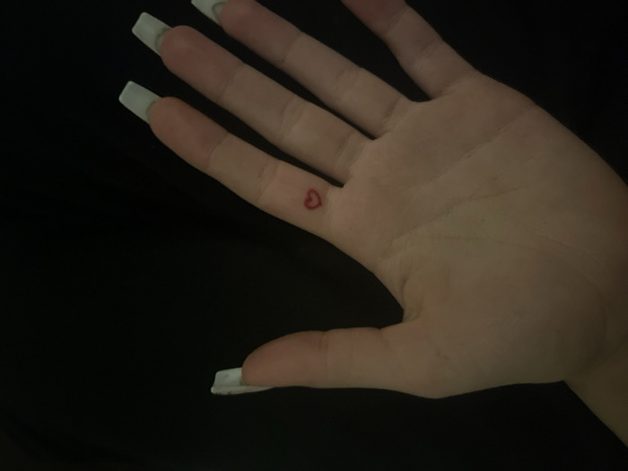 The image displays a fair-skinned human left hand, palm oriented upwards and slightly angled. All visible fingernails (index, middle, ring, and pinky) are elongated, coffin-shaped, and appear to be artificial, featuring a pale, possibly translucent finish. A small, distinct red heart-shaped mark is present on the palmar aspect of the middle finger, positioned near the distal interphalangeal crease. The mark exhibits a deep red color. The background is uniformly dark and featureless, indicating a dimly lit or unidentifiable environment. No contextual elements within the image provide information to determine its specific geographical location within the city of Ruse, Bulgaria, or any other location.