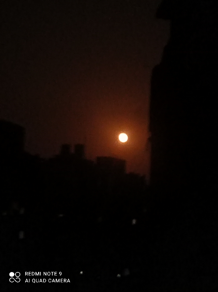 The image displays an urban or semi-urban landscape at night or twilight, identified as the city of Khan Yunis, Palestinian Territory. A prominent, bright, circular orange-yellow light source, consistent with a full moon or a strong artificial luminary, is positioned in the upper-middle of the frame against a dark, reddish-brown sky that fades into black. Silhouettes of multiple indistinct buildings and structures are visible in the mid-ground, forming a dark horizontal band beneath the light source. A large, dark, vertical mass occupies the entire right side of the frame, obscuring a portion of the scene. Faint, diffuse points of white and yellow light are discernible in the lower-left foreground, suggesting distant artificial illumination. No individuals, specific actions, or interactions are observable. The text "REDMI NOTE 9 AI QUAD CAMERA" is present in the bottom-left corner of the image.