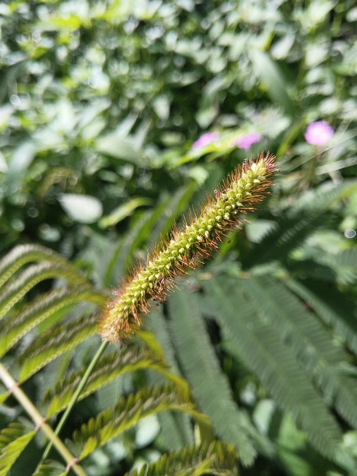 - "A fuzzy, green seed head with spiky, reddish-brown protrusions is in focus, prominently centered against a soft-focus background of green foliage" by FM-XhylU2, licensed under CC BY 4.0