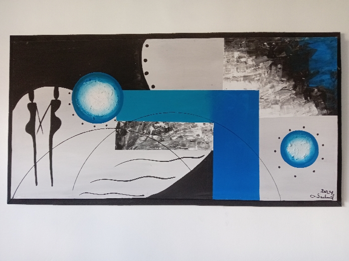 Abstract painting featuring geometric shapes and figures. Predominantly black, white, and blue hues are used. Two stylized figures stand on the left. Circular shapes are present in the top left and bottom right corners. A rectangular blue shape intersects the canvas. A smaller black and white rectangle sits beneath the top blue rectangle. Thin, curved lines intersect the lower portion of the composition. The painting is framed with a black border and appears to be signed.