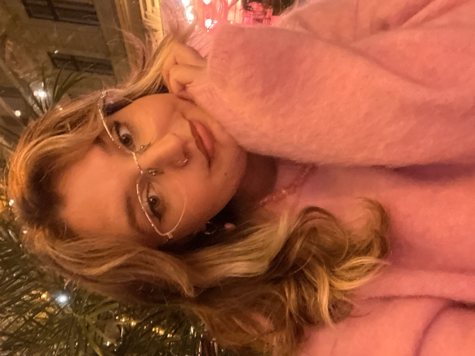 A close-up portrait features a young adult female with blonde and light brown wavy hair, styled with bangs. She wears clear-framed, semi-rimless glasses with a gold accent, a small stud piercing on her left nostril, and pink beaded dangle earrings. Her lips are lightly colored with a peach or light pink shade, and she presents a subtle smile. She is dressed in a light pink, fuzzy knit sweater and a matching pink beaded necklace. Her left hand, with fingers gently curled, rests under her chin. The background is softly blurred, showing dark green foliage adorned with small, round white lights on the left, and a dark urban building facade with visible windows on the right. Additional blurred red and pink light sources are visible on the right side of the background, contributing to a warm, ambient glow. The scene is consistent with an urban outdoor setting, such as a cafe or restaurant terrace at night, located in Budapest, Hungary.