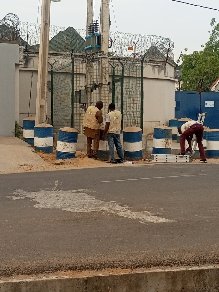 The scene is located in Maiduguri, Nigeria, at coordinates 11.819 latitude and 13.157 longitude. Three men are working on an electrical transformer. The transformer is located in an enclosed area with a chain-link fence. The men are wearing tan shirts with reflective vests. One man is working with a ladder and is wearing red pants. Another man is standing next to the transformer, looking at it. The third man is standing to the side, watching. The transformer is surrounded by several blue and white barrels, which are likely to be used for drainage. The ground is covered in dirt and sand. The sky is clear. The scene suggests that the men are working on the transformer as part of a routine maintenance or repair job.