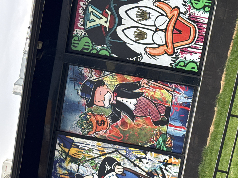 The image displays three framed pop-art panels, observed from a slightly upward angle against an overcast sky in Sofia, Bulgaria. The central panel features a stylized depiction of Mr. Monopoly (Rich Uncle Pennybags) wearing a black top hat, tuxedo, and red and white patterned trousers, winking. He holds an orange bucket overflowing with green banknotes, marked with a dollar sign. The background is a chaotic mix of graffiti tags, paint splatters, and drips in vibrant red, yellow, blue, and white. To the right, a panel presents Donald Duck's head, characterized by an orange beak and white feathers. He wears a black cap with a dripping blue and red Louis Vuitton logo, and his eyes contain golden crowns. Green dollar signs and pink and green paint drips are visible in the background around him. The left panel, partially visible, depicts a character resembling Mickey Mouse, also surrounded by flying green banknotes and graffiti elements. All three panels are enclosed in thick black frames. Below the panels, a strip of green grass is visible, partially obscured by a black metal railing. Above the panels, a black building overhang extends beneath the grey sky, with indistinct mechanical rooftop elements in the upper background.