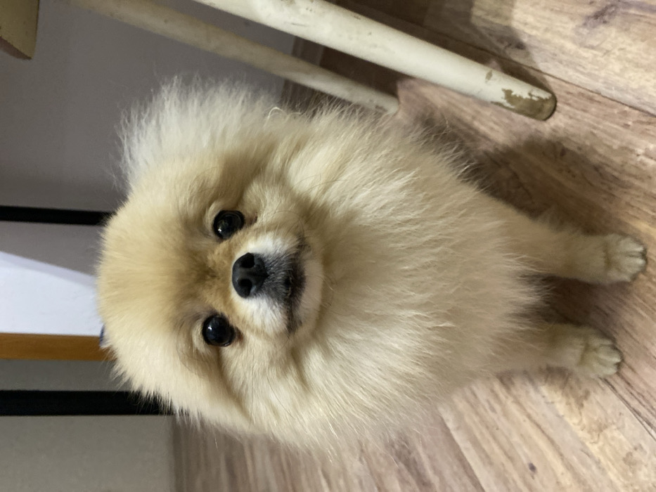 A fluffy, tan Pomeranian dog lies on a wood-patterned floor. Its round face features bright, black eyes and a small, black nose. The dog's fur is dense and puffed up, giving it a teddy bear-like appearance. Part of a white chair leg is visible in the background. The dog seems to be looking directly at the camera with a curious expression.