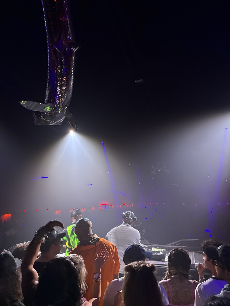 The image depicts a concert crowd in Indio, United States, likely at a music festival such as Coachella. The crowd is gathered in front of a stage where a DJ is performing. The stage is lit with bright spotlights and blue lasers. A large, shiny, fish-shaped inflatable hangs above the stage. The crowd is diverse in age and dress, with some people wearing bright colors and others wearing more casual clothing. Some members of the crowd are holding up their phones to record the performance. The atmosphere is energetic and excited.