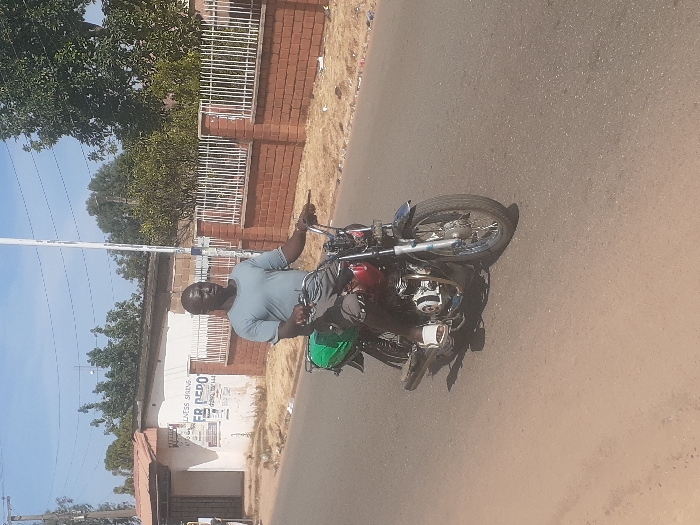 A man rides a motorcycle on an asphalt road in an outdoor setting. The motorcycle is dark-colored, with chrome handlebars and visible engine components. The man is wearing a light blue shirt. A green bag is secured behind him on the motorcycle. In the background, there is a brick building with a white metal fence on top of it, trees, and a light blue sky. The scene appears to be taken during daytime.