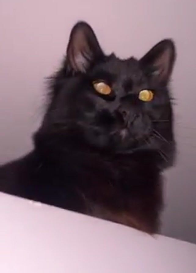 black cat peering over a white surface. Initially, the cat is looking to the right, then it turns to face the camera directly. The video then zooms in, becoming blurry and losing focus on the cat. Only the cat's fur and occasional flashes of its yellow eyes are visible.