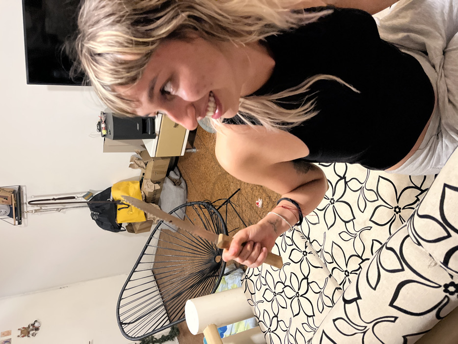 A woman with blonde hair and a black top smiles while holding a serrated knife. The scene includes a black metal chair, a floral patterned couch, and general household items. A TV is mounted on the wall, and boxes are scattered on the floor, giving the impression of a slightly cluttered living space. The photo is taken from a high angle, oriented in a portrait style.