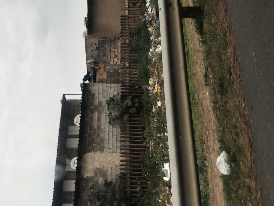 This image captures a roadside scene in Sandton, South Africa, under an overcast sky. In the foreground, a silver metal guardrail runs horizontally above a narrow stretch of asphalt and a dirt verge where a white plastic bag rests. Behind the guardrail, a wide strip of unkempt grass is heavily littered with various discarded items, including plastic bags, wrappers, and general debris. A dark, weathered wooden picket fence, partially obscured by green foliage, delineates the boundary with the background. Behind the fence, several residential structures are visible. The leftmost structure is constructed from grey concrete blocks with a dark corrugated metal roof, on which two white DStv satellite dishes are mounted, flanking rectangular, white-covered window openings. A patch of lighter, possibly plastered, material stands out on the concrete block wall below the roof. To its right, additional structures of varying construction quality, including walls of concrete blocks and a lighter rendered section, feature visible satellite dishes and draped materials on their upper portions. No individuals or explicit actions are present in the scene.