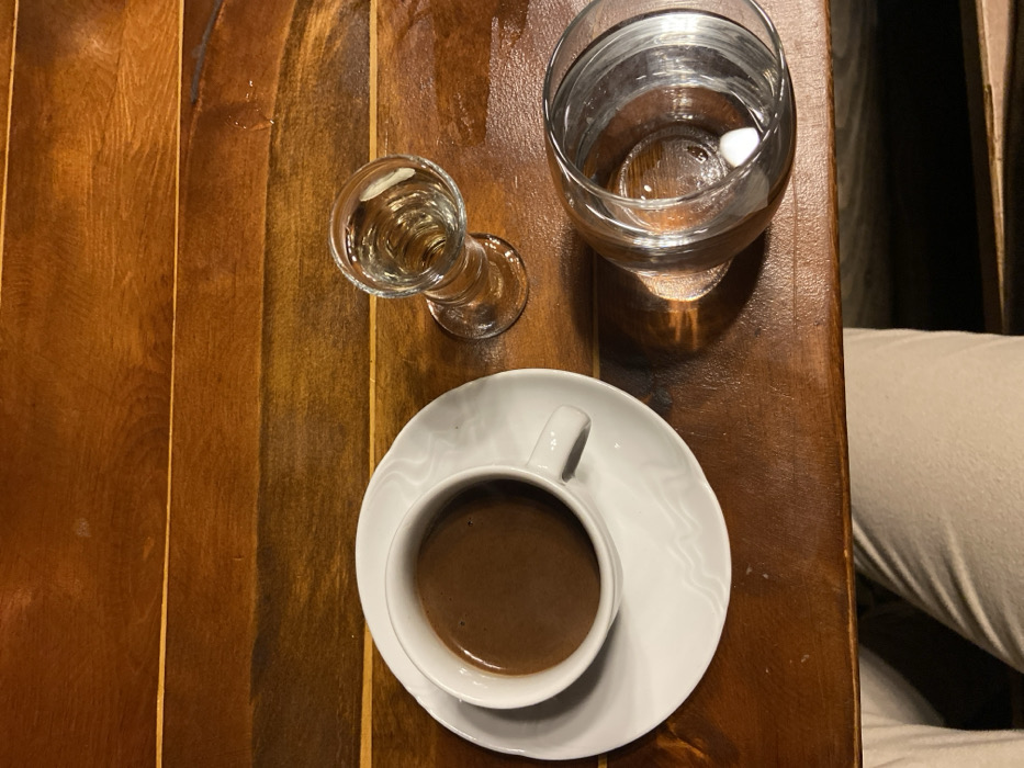 An overhead view captures a brown planked wooden table surface in Dulovine, Montenegro. On the left, a white ceramic cup containing dark brown liquid rests on a matching white saucer. To the right of the saucer, a clear stemmed glass is positioned, containing a clear liquid. Below and to the right of the stemmed glass is a larger, clear, cylindrical glass, also containing clear liquid, with a small white object visible at its base. The bottom left quadrant of the image shows a portion of a human leg clad in light-colored trousers, indicating a person is seated at the table. The lighting creates reflections on the glasses and highlights the wood grain.