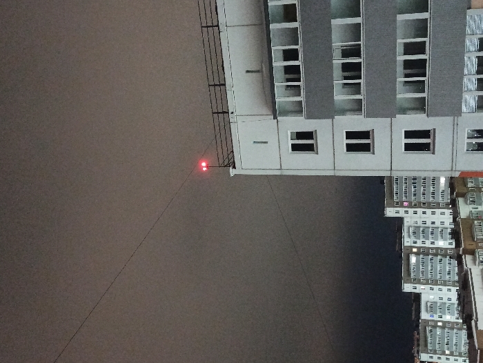 A nighttime cityscape is depicted with a gray sky dominating the upper half. Two red lights are positioned on a building near the center. The buildings are white and gray, with a few windows illuminated. Wires stretch across the sky. The image is rotated 90 degrees counterclockwise.