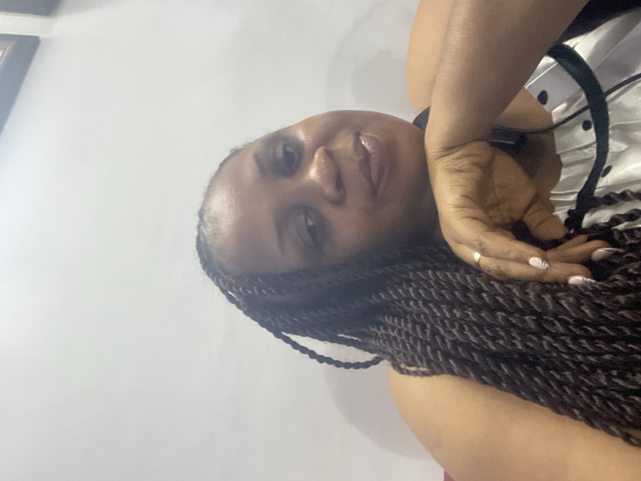 The image depicts an adult Black female in an indoor setting. Her hair is styled in numerous dark twists/braids that fall over her left shoulder. She has dark skin, full lips, and her eyes are directed slightly past the camera with a calm expression. Her left hand, adorned with a plain gold-colored ring on the ring finger and featuring manicured nails with light polish and dark accents, is positioned to support her chin. She is wearing a white garment with black polka dots and black trim, visible on her right side. The background is a plain, light-colored wall. A dark rectangular object, likely a framed item, is partially visible mounted on the wall in the upper right corner of the frame. The visual information available in the image does not provide confirmation for the specified location of Kagini, Nigeria.