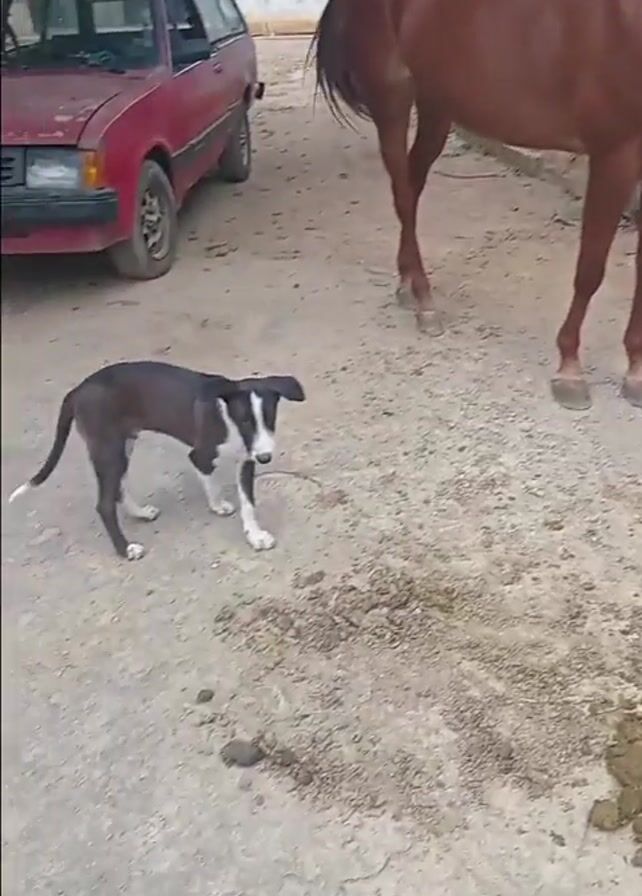 brown horse standing next to a white wall with a window barred with black iron. The horse is wearing a rope halter and has a white blaze on its face. A small black and white dog stands next to the horse. Behind the dog, there's an old red car, with a license plate that appears to read "KAX 270". The ground is concrete and littered with horse manure. The overall scene is in an outdoor space beside a building.