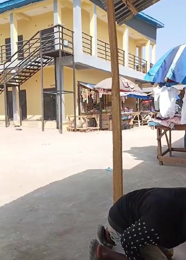 man kneeling on the ground under a metal and wood awning. He is wearing a black shirt and shorts, and his shoes are gray and green. He appears to be working on something on the ground. In the background, there is a two-story yellow building with blue trim and black metal staircases. There are also market stalls with various items for sale, covered by blue umbrellas. The weather appears to be sunny and the sky is clear.