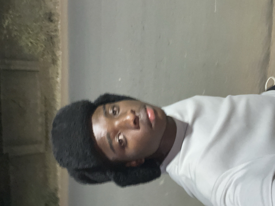 A person with brown skin, wearing a dark fur hat, looks at the camera. The person is also wearing a white long-sleeved shirt. The background is blurry and appears to be an outdoor setting, with a concrete or asphalt surface and some vegetation. The image is slightly rotated, with the person's head tilted to the left. The lighting is dim, giving the picture a somewhat muted tone.