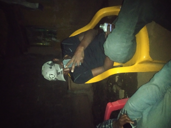 In a dark setting, a person in a camo hat sits in a yellow plastic chair, holding a phone. Their arm rests on the chair's back. Nearby, a red plastic chair is partially visible. Another person is leaning on the yellow chair, wearing jeans and a checkered shirt sleeve is seen with a phone in hand. The lighting is dim, making details hard to distinguish.