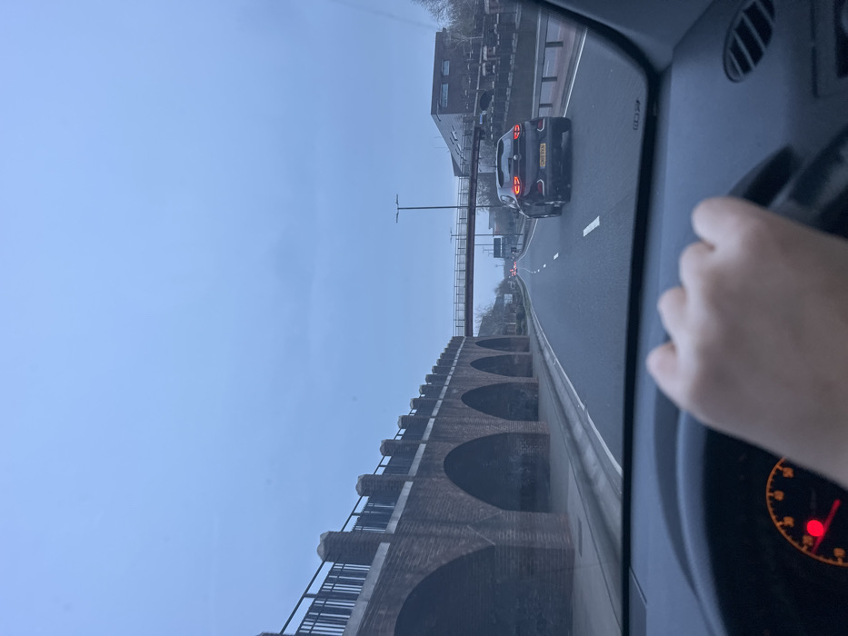 The scene depicts a roadway from the perspective of a vehicle's driver, looking eastward on Pier Road in Gillingham, Kent, United Kingdom. The observer's right hand grips the steering wheel of a right-hand drive vehicle, with a partially visible orange-lit dashboard dial showing a red indicator. The environment is an urban road under an overcast, light blue-grey sky. A two-lane asphalt carriageway extends into the distance, marked with white dashed lane lines. To the left, a multi-arch brick railway viaduct runs parallel to the road, featuring a dark metal railing atop a brick parapet with decorative stone finials. The underside of the arches is dark. To the right, a dark-colored SUV (license plate GM18 FXN) travels in the right lane, its rear lights illuminated. Beyond this vehicle, a reddish-brown pedestrian bridge with metal railings spans across the road. Further right, a multi-story building with dark brickwork and windows is visible, likely part of a commercial or industrial complex. Multiple streetlights are present along the roadside. No other individuals are visible.