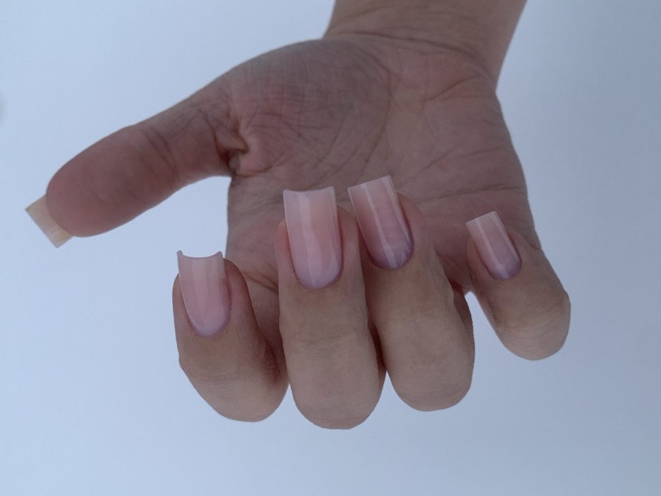 The image displays the dorsal aspect of a human hand, identified as a left hand, presented against a uniform, light-colored background that appears to be light grey or very pale blue. The hand exhibits five visible fingers, each featuring a long, square-shaped artificial nail with a translucent pale pink or nude finish. The nails appear consistently shaped and extended. The thumb is partially visible at the top, also featuring an extended nail. The fingers are slightly curved, and the hand is held in an upright position. No distinguishing features or objects are present in the background. The scene is located in the city of Фоки, Russia.