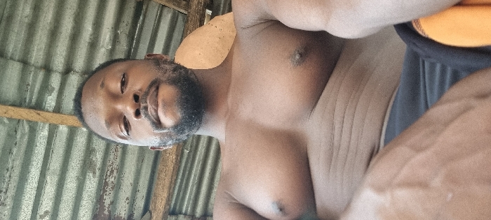 A man poses shirtless, looking directly at the camera. He has dark skin, a beard, and a shaved head. The background features corrugated metal and wooden beams, suggesting an outdoor or semi-outdoor setting. The lighting is slightly harsh, with shadows and highlights emphasizing the man's physique. He appears relaxed and confident.