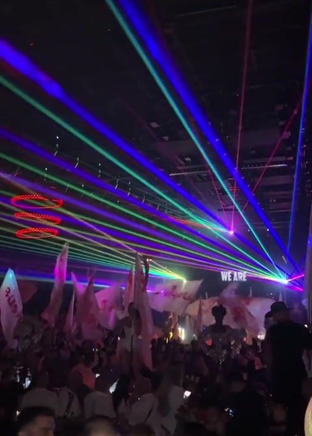 The video captures a vibrant nightclub scene. A large crowd of people is gathered, many holding and waving white flags with text that appears to be “BUSHIDO.” The word “BUSHIDO” is also displayed in large, glowing neon letters above the crowd. Laser lights in green, blue, and red are crisscrossing above the crowd. Several circular red light fixtures are also visible. People are dressed in various attires, with some wearing hats. Individuals are holding up their phones, seemingly recording the event. A spotlight is shining down on the crowd.