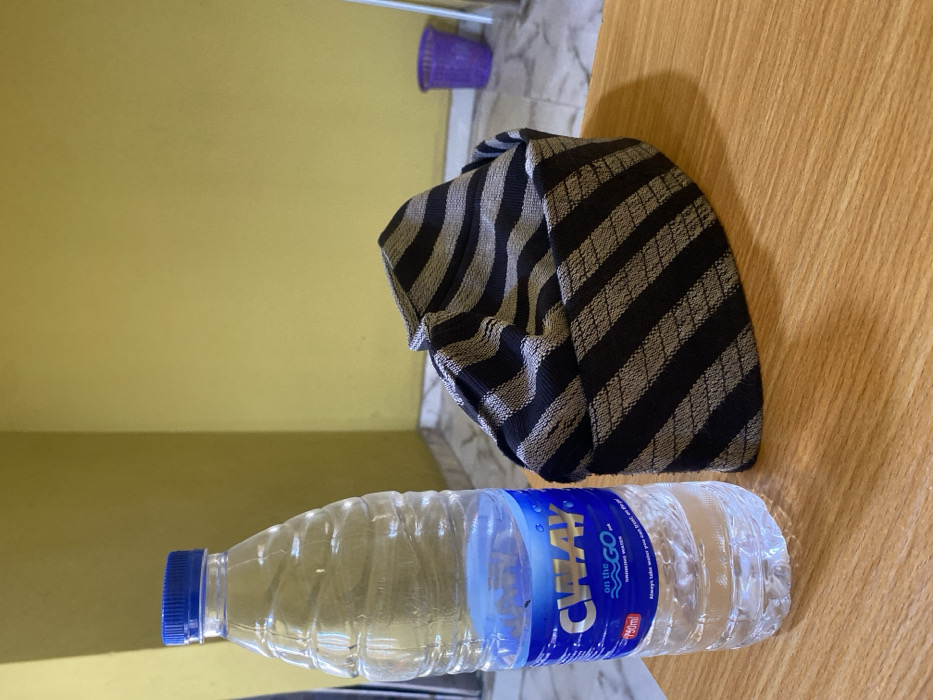 The image depicts a static indoor scene in Egan, Nigeria. In the foreground, positioned on a light brown wooden surface, are two primary objects: a partially full 750ml clear plastic bottle of "CWAY on the GO" drinking water with a blue screw cap, and to its right, a folded or collapsed textile cap. The cap features alternating diagonal stripes of black and light grey or off-white. The background consists of a room with mustard yellow-painted walls. The floor is visible in the lower background, appearing to be light-colored tile or marble with darker grout lines or veining. In the far right background, a small purple plastic bucket or container is visible on the floor, adjacent to a narrow, vertical metallic object, possibly a pipe or frame. No individuals are present.