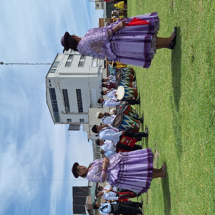 Two women wearing ornate purple dresses and hats stand facing each other in a grassy area. A line of drummers stands between them, wearing white shirts and carrying large drums. Behind the drummers, a tall white building rises against a cloudy sky. In the background, other people wearing colorful clothing can be seen. The scene appears to depict a cultural event or celebration.
