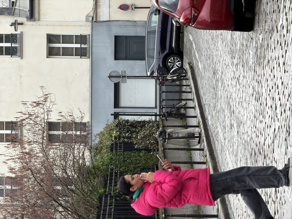 A street scene in Paris, France, depicts a woman walking across a wet cobblestone street. The woman, mid-stride from left to right, wears a bright pink puffer jacket, dark pants, and dark platform sneakers. She holds a lit cigarette in her right hand, exhaling smoke, and a smartphone in her left hand. To the right of the woman, a row of black metal bollards lines the sidewalk. Behind the bollards are a silver metal trash receptacle and two parked bicycles. Further right, a dark blue minivan is parked on the street, partially obscured by the rear of a red hatchback in the foreground. The background features a multi-story Parisian building with an off-white upper facade displaying multiple windows, some with wrought-iron balconies. The lower section of this building is light blue-grey, featuring a white roll-down security shutter and a dark grey door. A deciduous tree with bare branches and reddish catkins partially covers the upper left portion of the building. The sky is overcast.