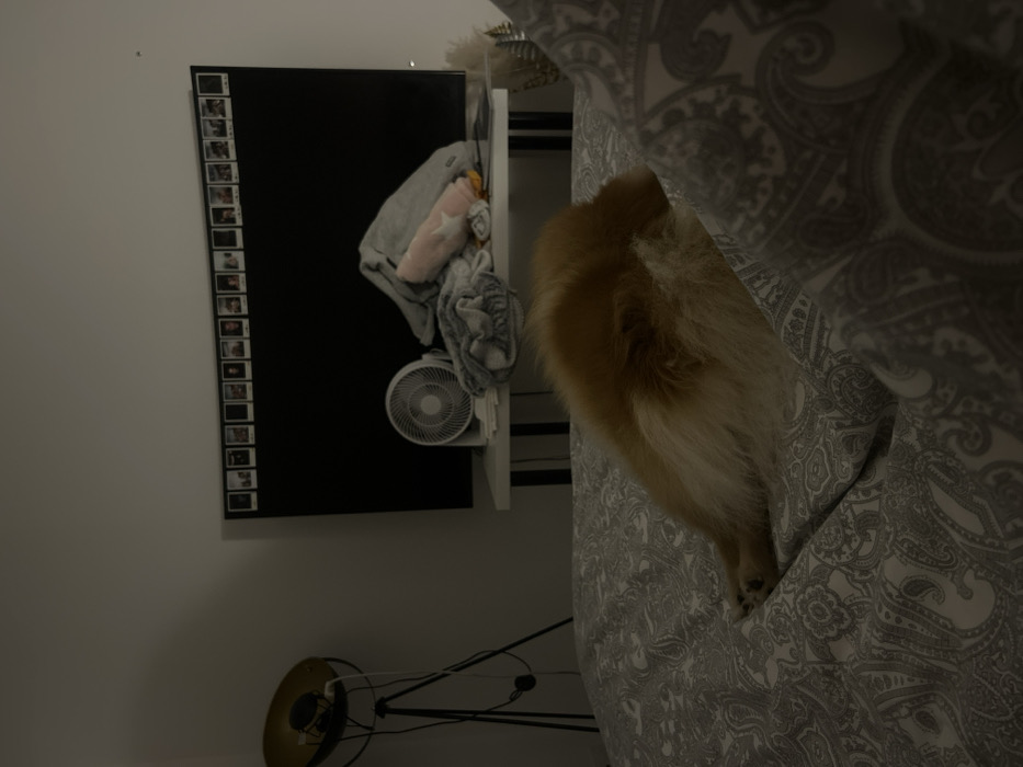 A light brown dog curls into gray paisley-patterned bedding. A black frame with affixed photos borders a desk and a small white fan. Gray and pink clothes are atop the desk. A gold lamp stands on the floor beside the bed. The wall is a light gray.