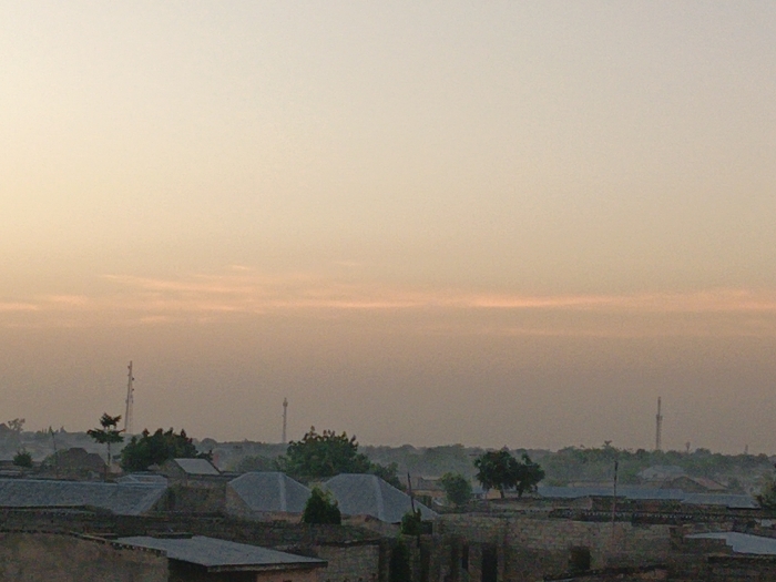 A hazy, pastel-toned sunrise illuminates a sprawling cityscape. Low-rise buildings with metal roofs dominate the foreground, merging into a dense urban landscape dotted with sparse greenery. Transmission towers rise in the distance, piercing through the atmospheric haze. The sky transitions from a pale yellow at the top to a soft orange near the horizon, creating a serene yet somewhat obscured view.