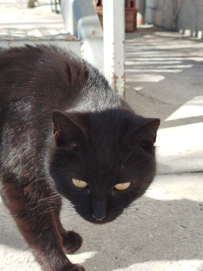 The image displays a black domestic cat situated outdoors in Klenovik, Bulgaria. The cat occupies the foreground, positioned with its head slightly lowered and its prominent yellow eyes directed towards the viewer. Its dark fur exhibits sunlit reflections across its back and shoulders, hinting at subtle reddish-brown undertones. The animal's whiskers are visible. The ground surface is light-colored and appears to be concrete or pavement, marked by distinct, elongated striped shadows indicative of an overhead structure under bright sunlight. In the mid-ground, a weathered white vertical column, showing signs of rust or degradation at its base, is present. Indistinct light-colored architectural elements and a reddish-brown object are discernible in the background.