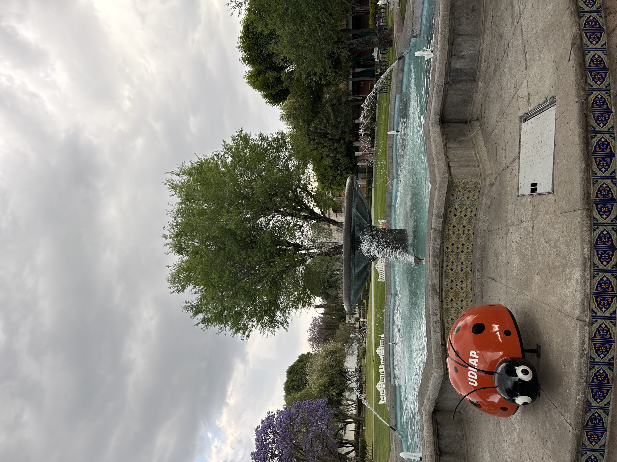 This image depicts a public park scene in San Andrés Cholula, Mexico, under an overcast sky. In the immediate foreground, an octagonal fountain with a multi-tiered bronze basin sprays water from several jets into a light blue pool. The fountain's base is constructed from concrete and adorned with decorative blue, yellow, and white patterned tiles. To the left of the fountain, resting on the concrete paving, is a large, glossy red sculpture of a ladybug with black spots and a black head, featuring white eyes with black pupils and black antennae. The word "UDIAP" is inscribed in white capital letters on the ladybug's back. To the right of the ladybug, a rectangular metal access panel is embedded in the paving. Beyond the fountain, a manicured green lawn extends into the midground, dotted with several trees. A prominent tree on the far left exhibits vibrant purple blossoms, while others display rich green foliage. White decorative metal benches are arranged on the grass. In the background, further trees obscure parts of a building with light-colored walls. Towards the right background, a small outdoor seating area with tables, chairs, and green umbrellas is visible. One individual is faintly discernible walking across the grass in the mid-distance. The sky above is entirely covered with grey and white clouds.